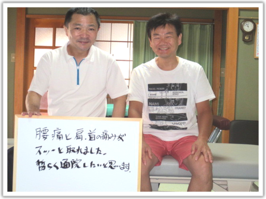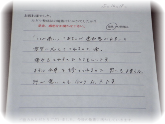 今日で3度目の施術を受け痛みも楽になりました。本当にありがとうございました。